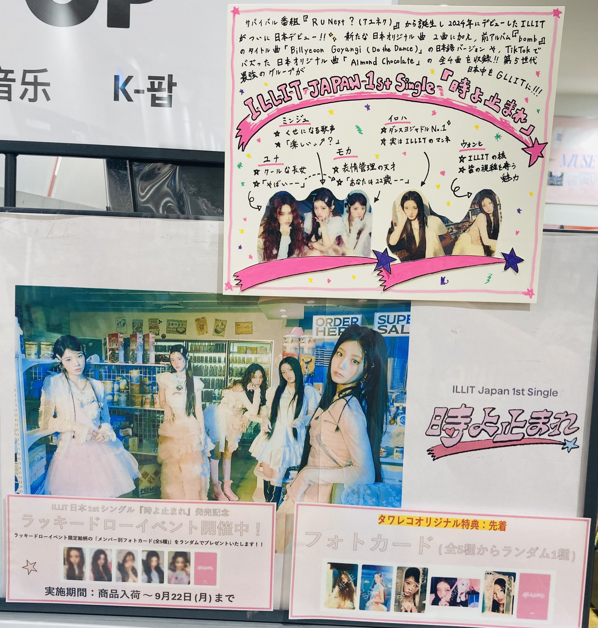 | 商品の特徴 | ILLIT アイリット 時よ止まれタワレコパネル当選ミンジュ。NEWS | ILLIT JAPAN OFFICIAL SITE。ミンジュ ILLIT 時よ止まれ 初回限定盤 封入 チェキ クリア トレカ 2種。タワレコ限定のミンジュのパネルです。ILLIT アイリット ミンジュ トレカ セット 時よ止まれ bomb - メルカリ。元々展示されていたものなので多少の傷はご理解ください | ||